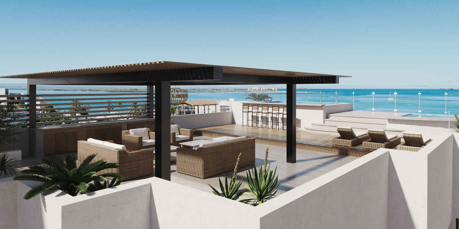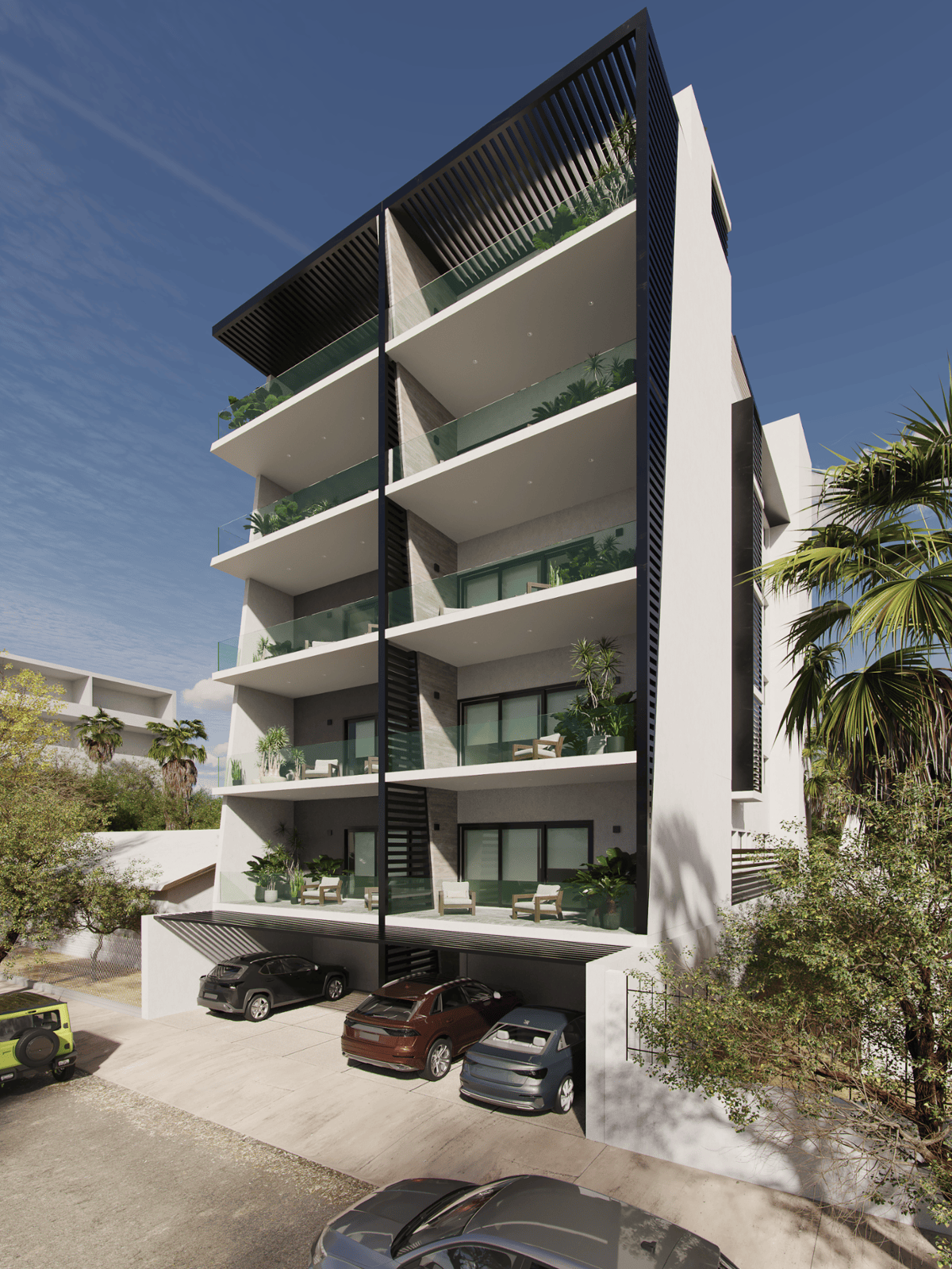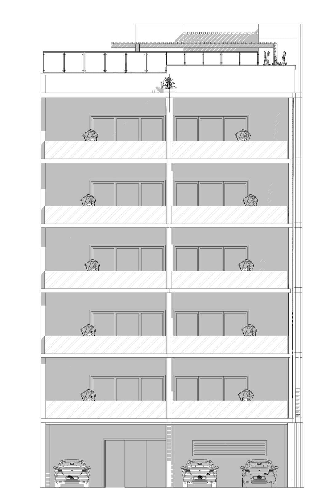 Proyecto habitacional de 10 departamentos de una planta, distribuidos en 5 niveles. Desarrollo en el municipio de La Paz Baja California Sur en un terreno de 326.10 m². Cada uno cuenta con terraza y estacionamiento privados, además de contar con Roof Garden, alberca y área de BBQ de uso compartido.