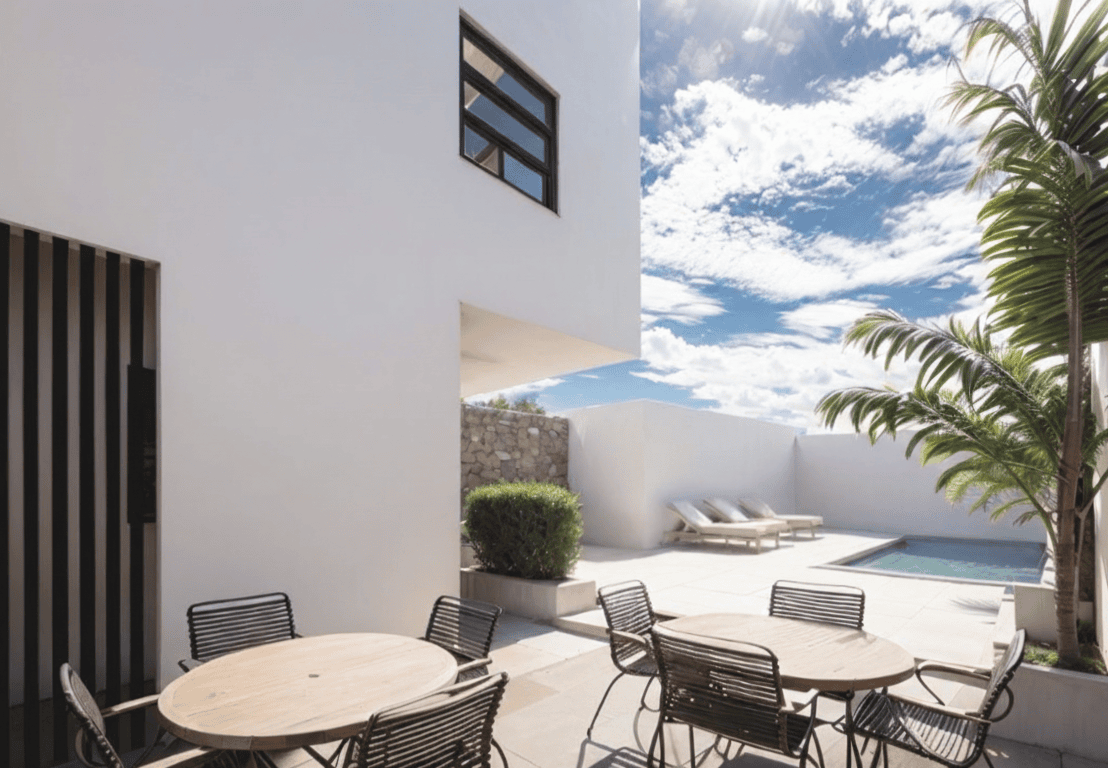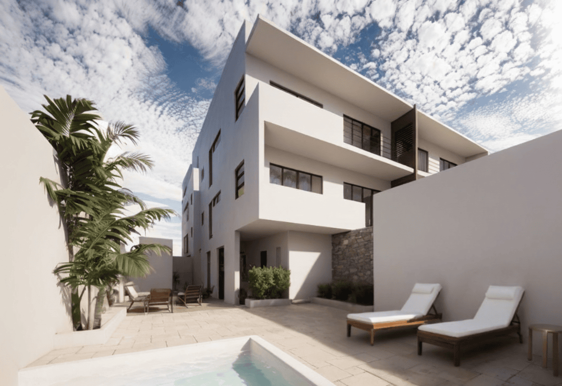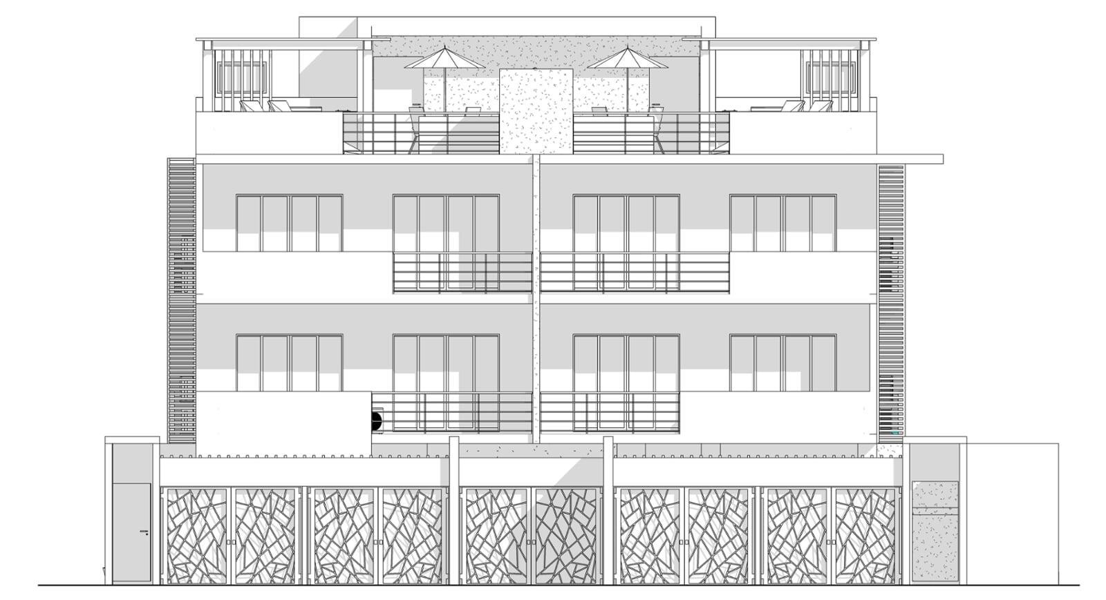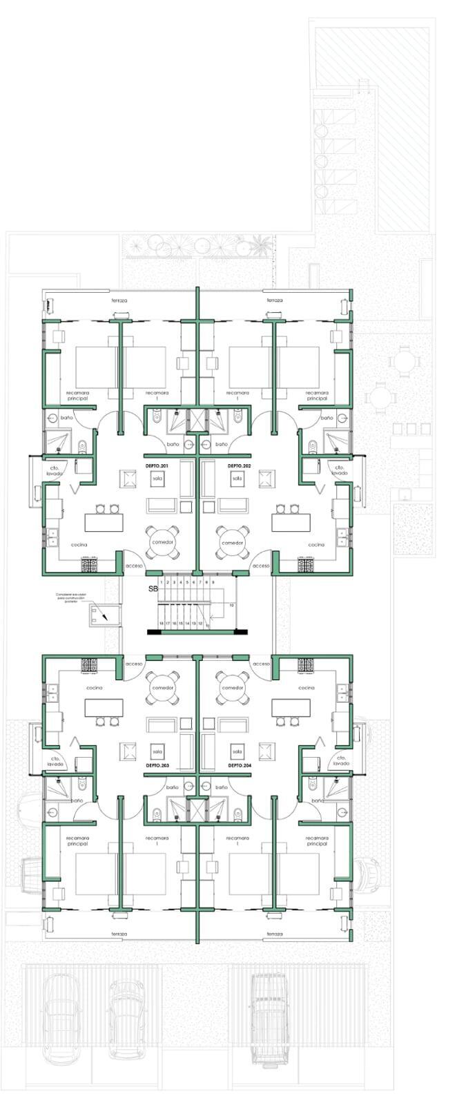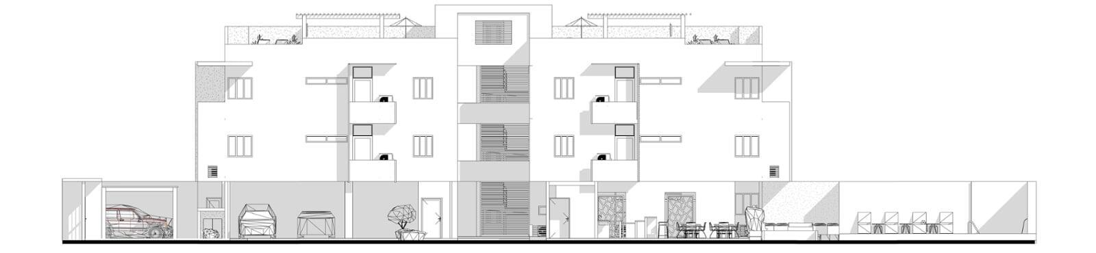 Proyecto habitacional de 10 departamentos de una planta, distribuidos en 5 niveles. Desarrollo en el municipio de La Paz Baja California Sur en un terreno de 326.10 m². Cada uno cuenta con terraza y estacionamiento privados, además de contar con Roof Garden, alberca y área de BBQ de uso compartido.